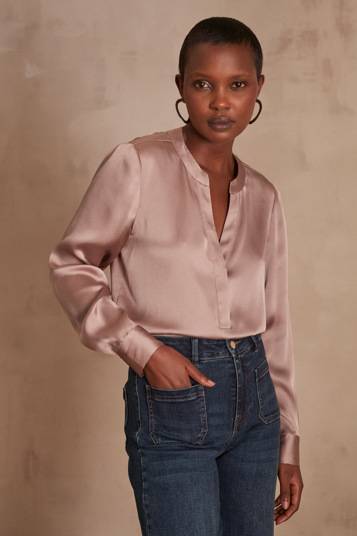 Fall for our MARIE satin blouse in a luscious rosewood shade.