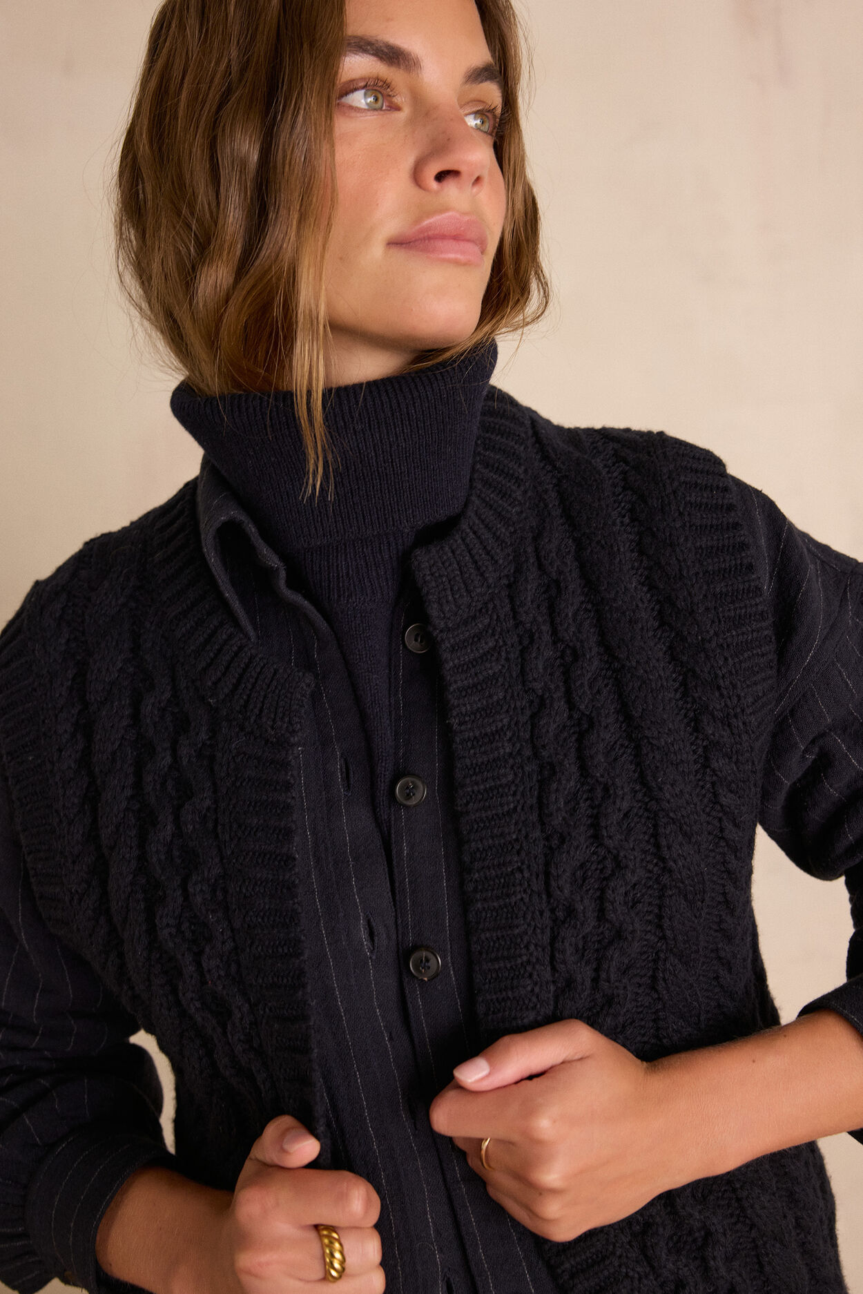 Fall for BIXENTE, our RWS wool cardigan that combines elegance and comfort. Its cable knit adds a touch of sophistication to your outfits.