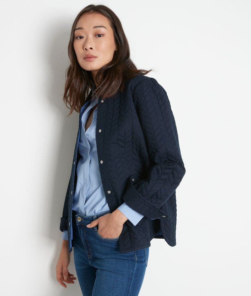 Our FABIOLA jacket is a real charmer! This cotton jacket is packed with enchanting unique details. It has a straight cut, shirt collar, long sleeves and poppers. We especially like the padding with its delicate leaf-like design. It makes the ideal mid-season jacket and also works well as an overshirt under a coat while you wait for warmer weather.