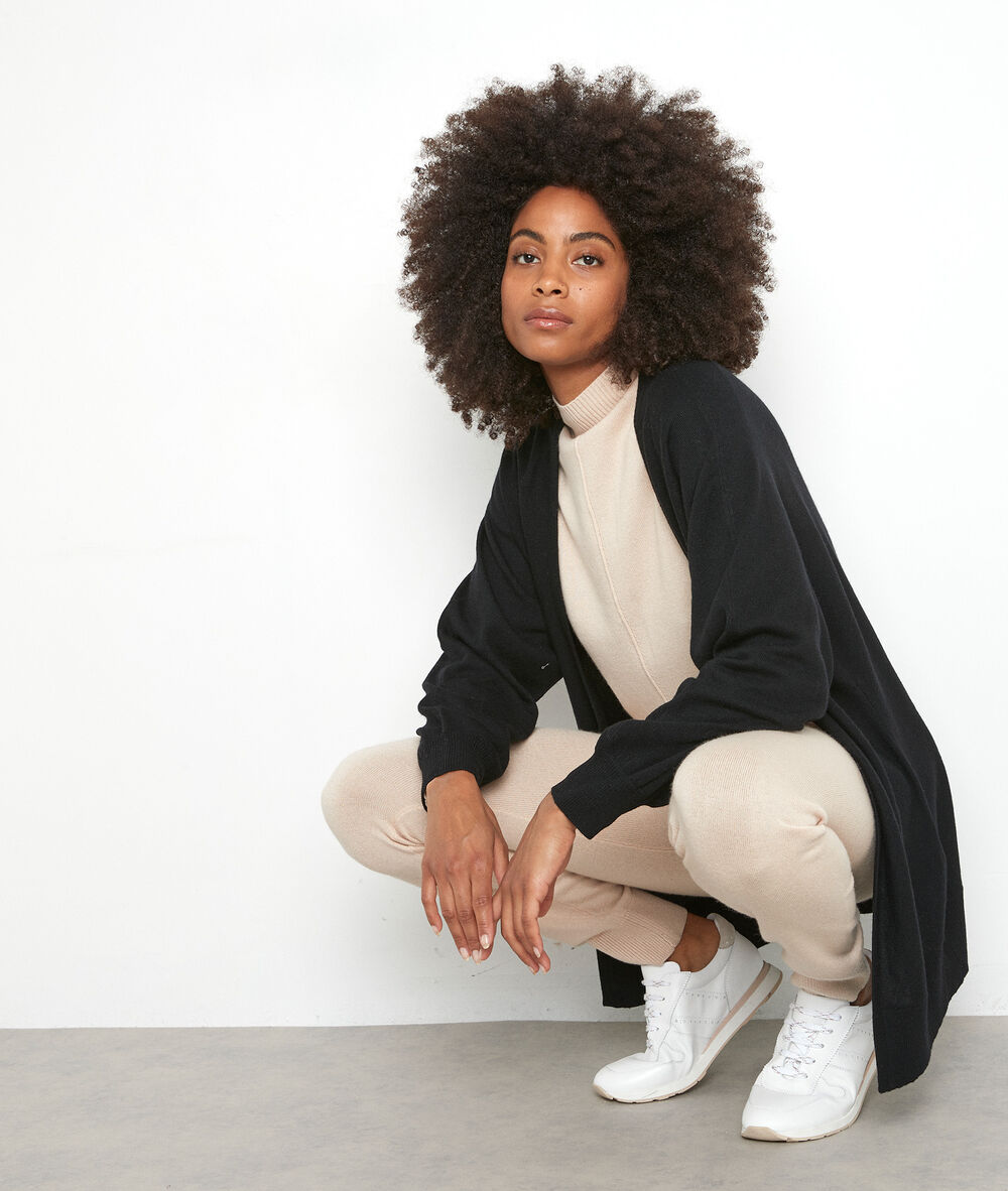 WECARE: This cardigan is made using recycled polyester. As new polyester is made using fossil fuel resources, recycling the fibres can considerably reduce the use of these limited natural resources. By reusing pre-worn synthetic clothing and recycling plastic bottles, Maison 123 is committed to reducing waste and preserving non-renewable resources. Unparalleled comfort and softness can be yours with the TERENCE cardigan. A 30% wool blend makes it great for wrapping up in. This long cardigan has no buttons and narrow sleeves, and would work well with a loungewear outfit or to add warmth to a city style look.